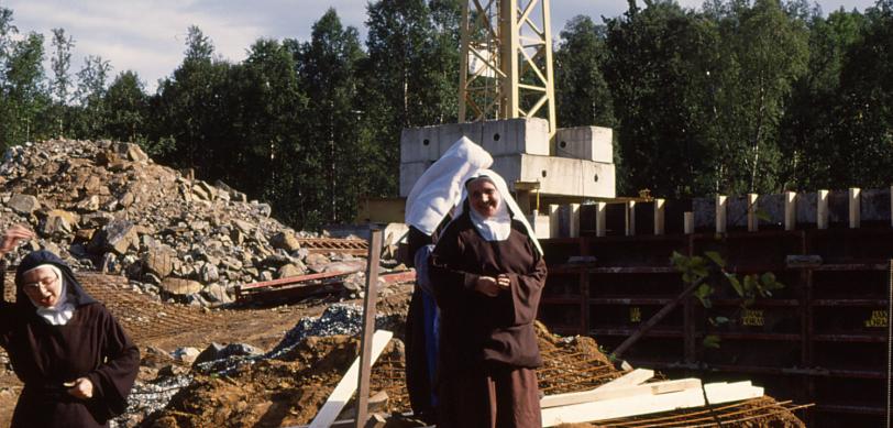 Etter karmelittnonnenes konstitu-sjoner blir det dispensert fra klausurbestemelsene i byggeperioder, slik at nonnene kan ta del i arbeidet. Snart var de i aktivitet på tomten, hvor de ryddet og laget gjerde. Da de kunne slippe til i en del av råbygget, tok de fatt på innredningen. De murte og snekret og malte. Slektninger og venner kom på besøk og ville hjelpe. Ved egeninnsats kunne man redusere utgiftene, slik at de disponible midler kunne rekke lenger. Fremdriften gikk etter planen. Den 16. oktober var det grunnsteinsnedleggelse, og den 7. mars 1995 kunne man holde kranselag. Aktiviteten var intens utover våren og sommeren. Kontrakten med entreprenøren ble utvidet til å omfatte kirke. Underentreprenører ble engasjert. Nonnene hadde lange arbeidsdager.